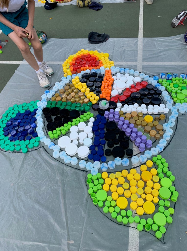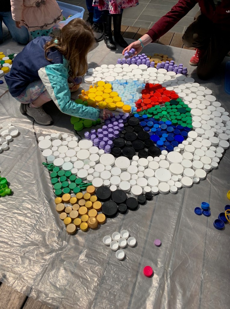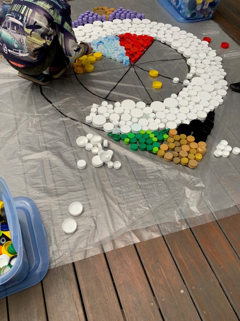 The power of this work comes from the collaborative element, as participants shared through the simple gesture of placement of each coloured top, catalysing a meditative approach to fill the shapes with vibrant patterns and colour. Once the beauty of the Mandala is complete, it is then dispersed and disappears through the act of shaking the plastic sheet it is created on. This symbolises the importance of recycling each plastic top making up this artwork to help care for the planet.