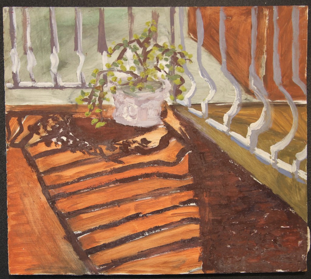 Using colour to create form and lighting conditions, the exterior scene of a single pot plant on the balcony shown in strong sunlight contrasts with the softer harmonious colours of the interior scene.