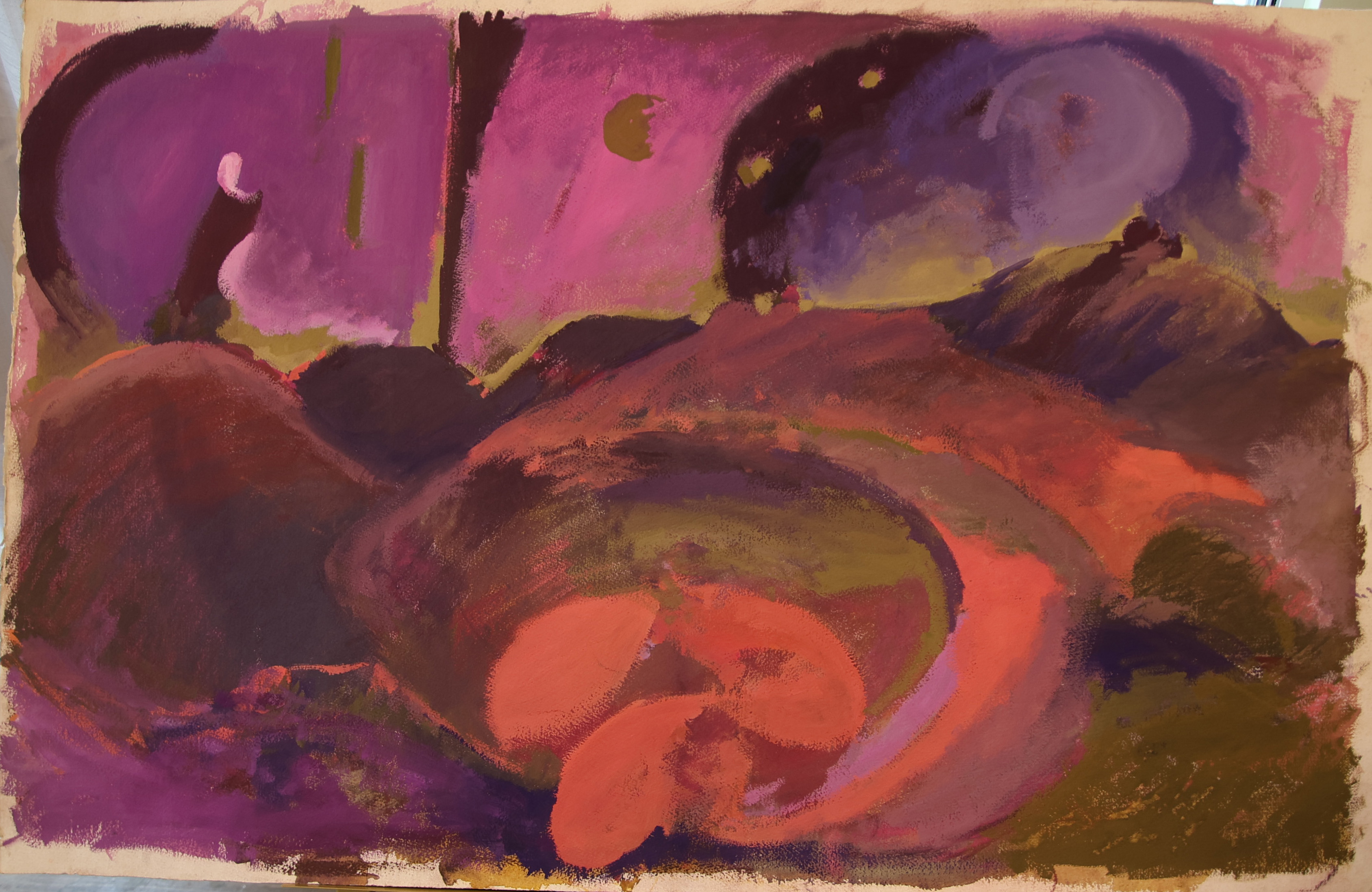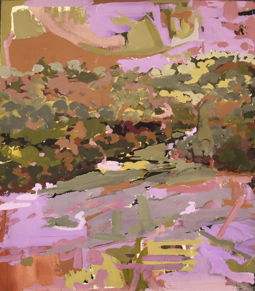 This series of landscapes continues to explore my obsession with the use of colour to create atmosphere, conveying the unique and special lighting conditions which constantly change with the cycle of the seasons and times of day. The forms of the trees, mountains, and other elements of the landscape are all shown in base geometric forms to describe the underlying natural architecture that has continued to shape our environment over the millennia of its existence.